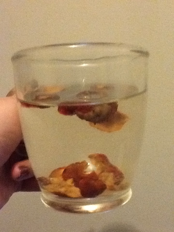 Outsides: When you open up the packet, it looks like a bunch of cut-open berries (which is exactly what they are). I added the entire packet to 8 ounces of boiling water but I have no idea is that's what I'm supposed to do. The liquid has a slight pink tint to it and smells like prunes.